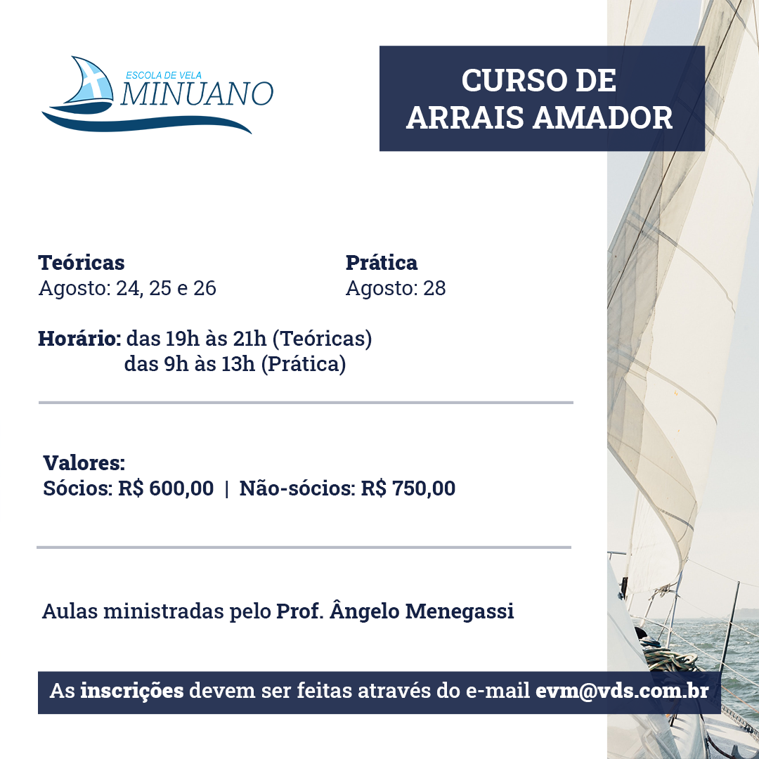 Estão abertas as inscrições para a nova turma de Arrais Amador da Escola de Vela Minuano do Veleiros do Sul. Ministradas pelo professor Ângelo Menegassi, as aulas teóricas serão de 24 a 26 de agosto, e a teórica sábado, 28 de agosto.